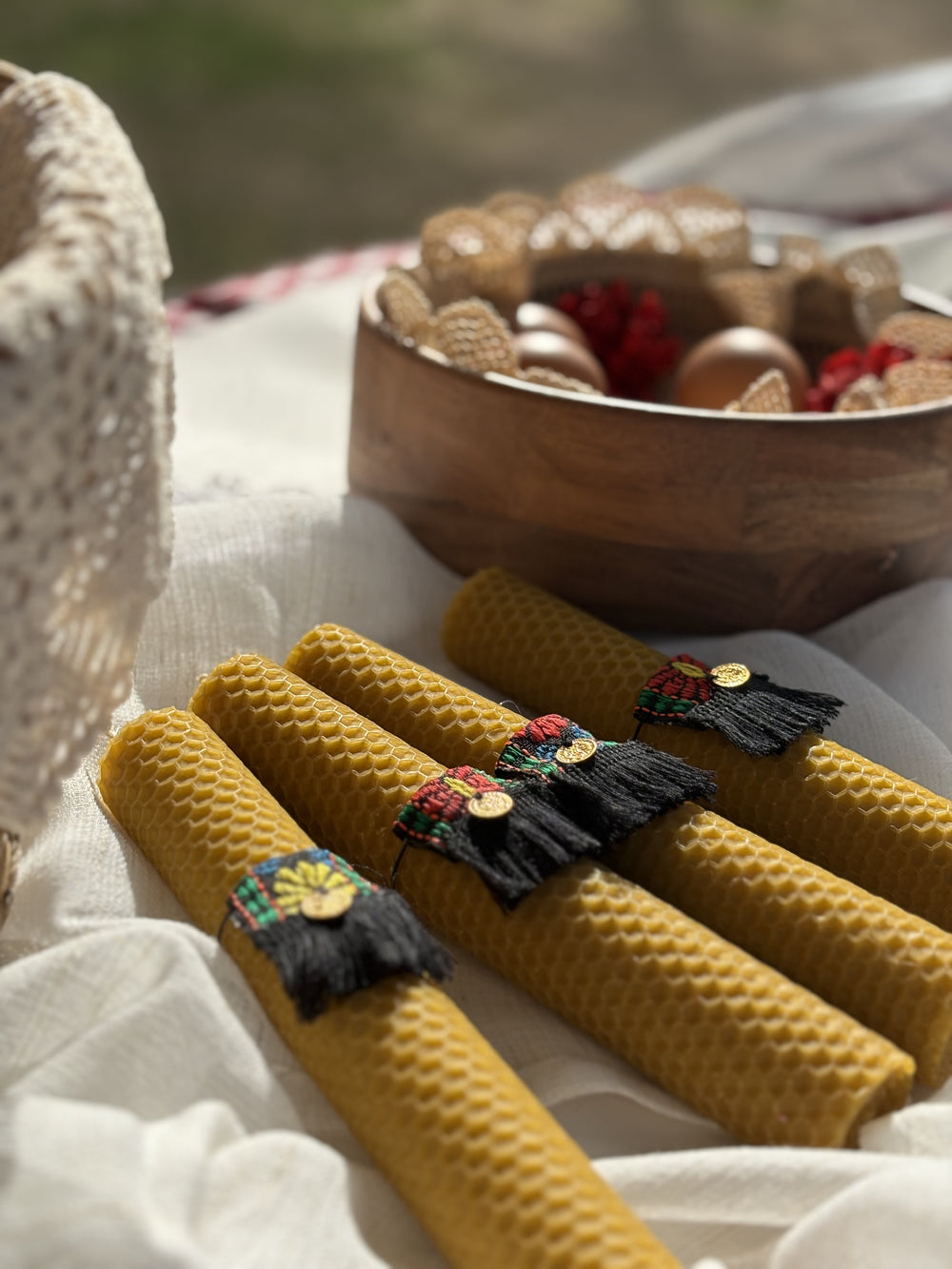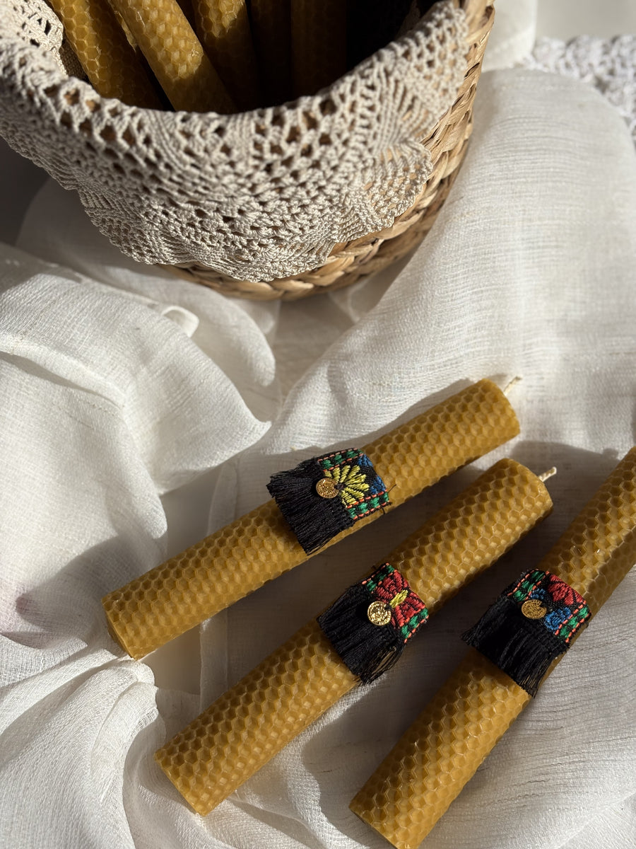 Χειροποίητη λαμπάδα από φύλλα κερήθρας στολισμένη με τρέσα και φλουριά ραμμένα στο χέρι, σαν παραδοσιακή φορεσιά της Θράκης♥