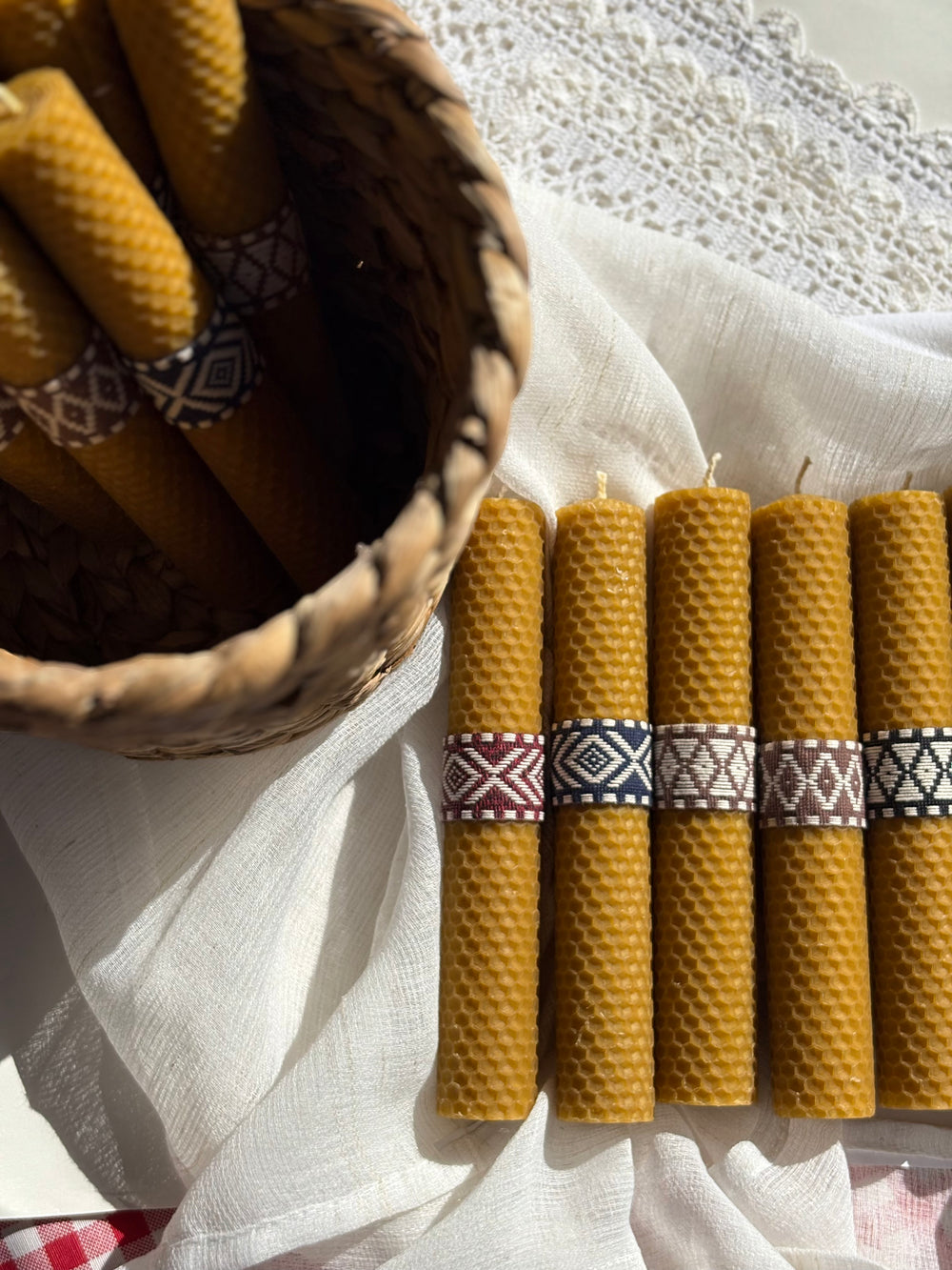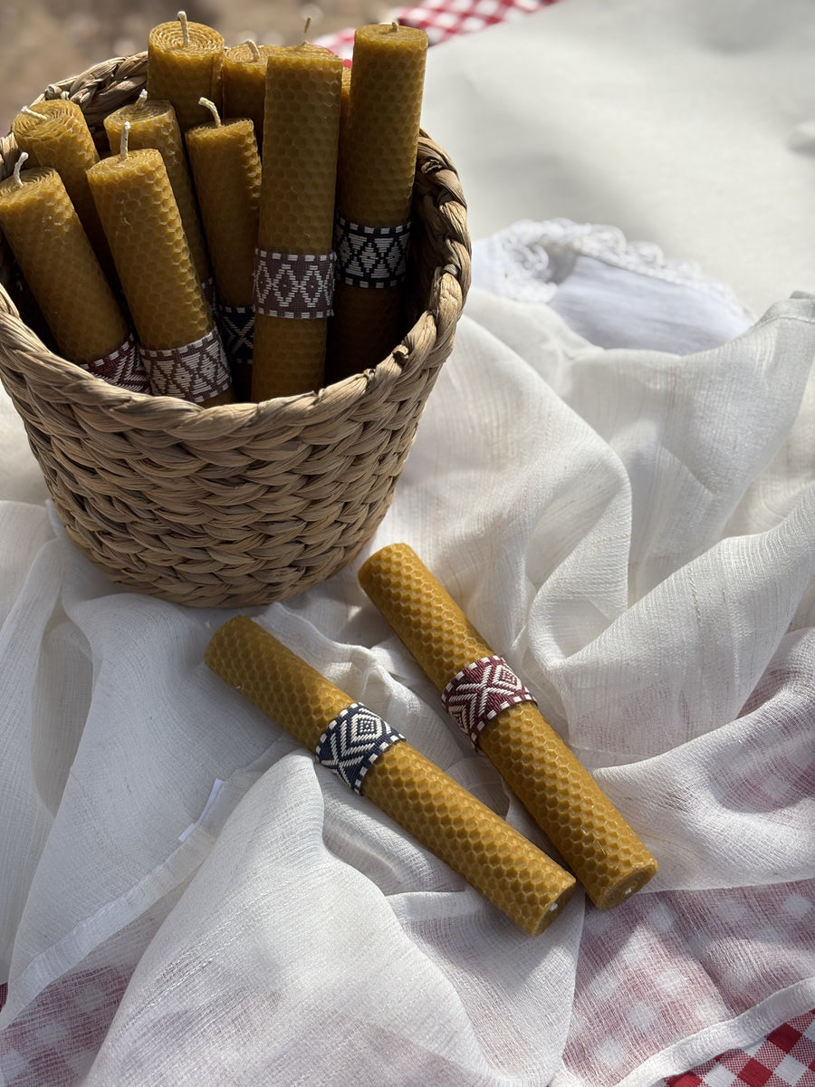 Χειροποίητη λαμπάδα από φύλλα κερήθρας τυλιγμένη με τρέσα που μοιάζει να βγήκε από παλιό αργαλειό♥