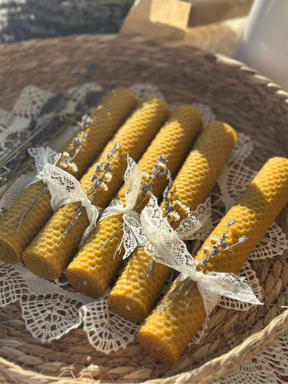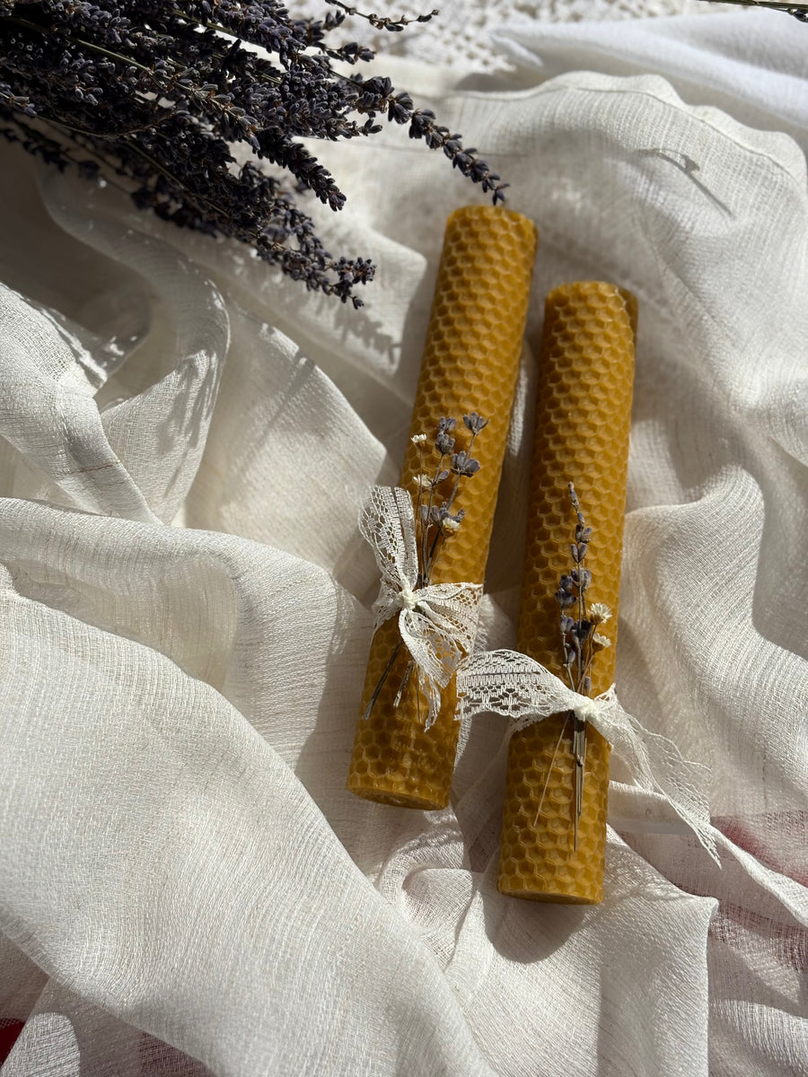 Χειροποίητη λαμπάδα από φύλλα κερήθρας διακοσμημένη με αποξηραμένα άνθη λεβάντας και λευκά glixia τυλιγμένη με λευκή δαντέλα♥