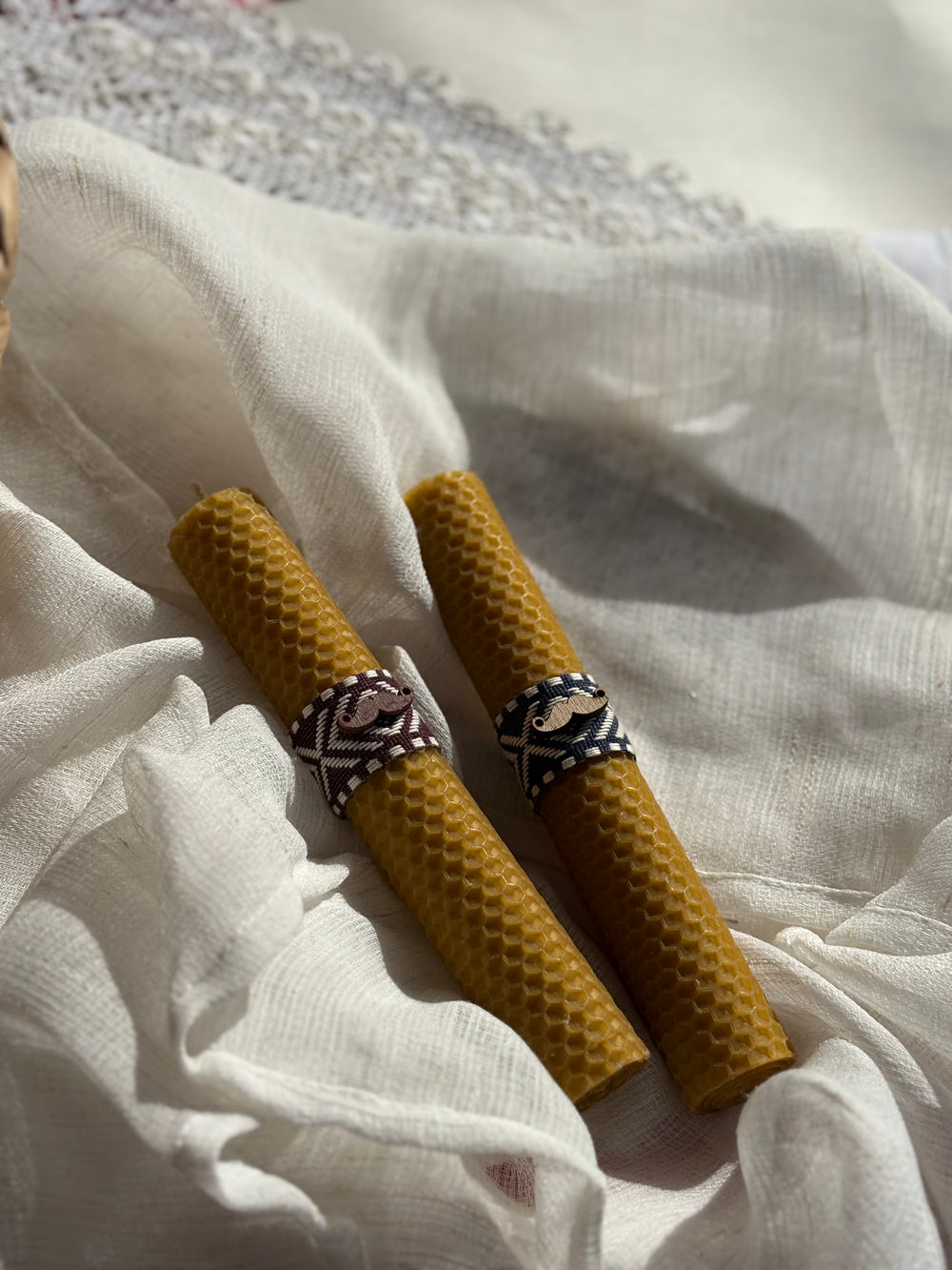 Χειροποίητη λαμπάδα από φύλλα κερήθρας στολισμένη με τρέσα που θυμίζει υφαντό αργαλειού και ξύλινο μουστάκι – σαν τους κυρίους που σύχναζαν στους καφενέδες, πίνοντας ελληνικό καφέ & ανταλλάσσοντας ιστορίες.