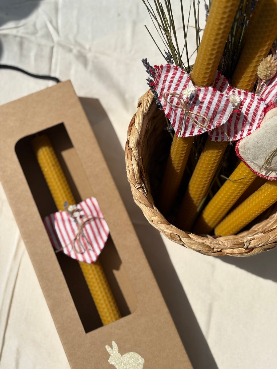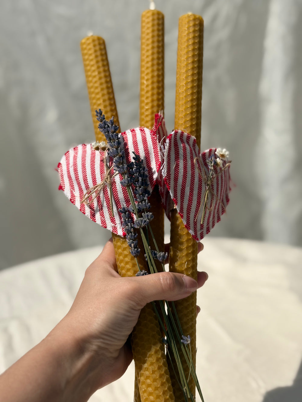 Χειροποίητες λαμπάδες από φύλλα κερήθρας, στολισμένες με αρωματικά διακοσμητικά γεμισμένα με άνθη βιολογικής λεβάντας.